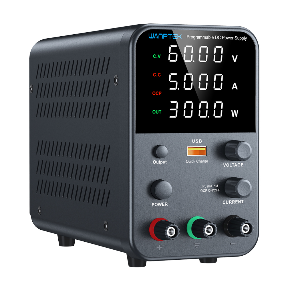 WPS系列产品是三窗口四位数显高精度程控直流稳压电源,可同时显示电压,电流,功率。产品广泛应用于手机维修、电脑维修、电池充电、学校教学和生产线使用。使用编码电位器可以在0和标称值之间连续调节输出电压和输出电流,并且可以预先显示设定值,方便使用和调节。本机具有USB快速充电功能,支持多种快速充电协议。具有完美的OVP、OCP短路保护电路,该产品还提供上位机通信功能 (可选),方便用户使用USB或RS485连接线将电源与PC连接,也可以通过不同的转换线实现USB转RS232/485接口,即可通过软件界面控制电源使用,实现远程操作。电源的稳定性和纹波系数非常好。其体积小,设计美观,操作方便,满负荷可长时间工作,深受用户喜爱。
