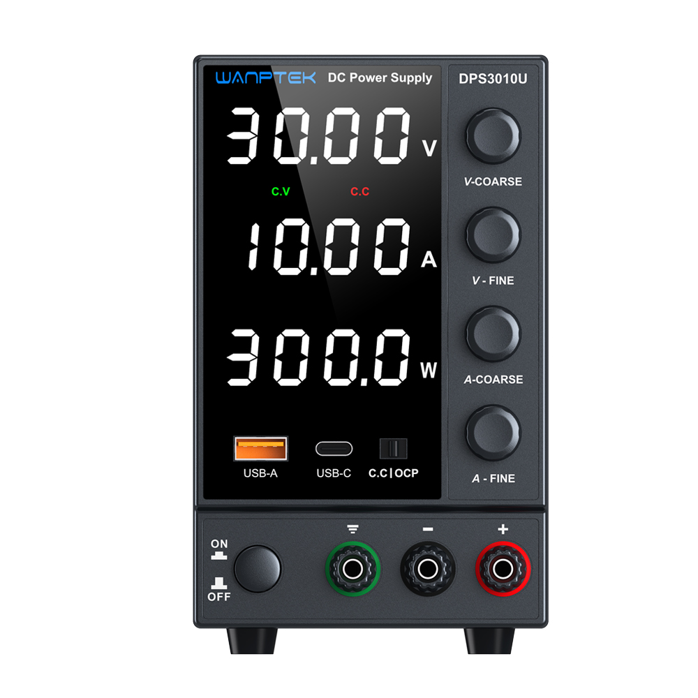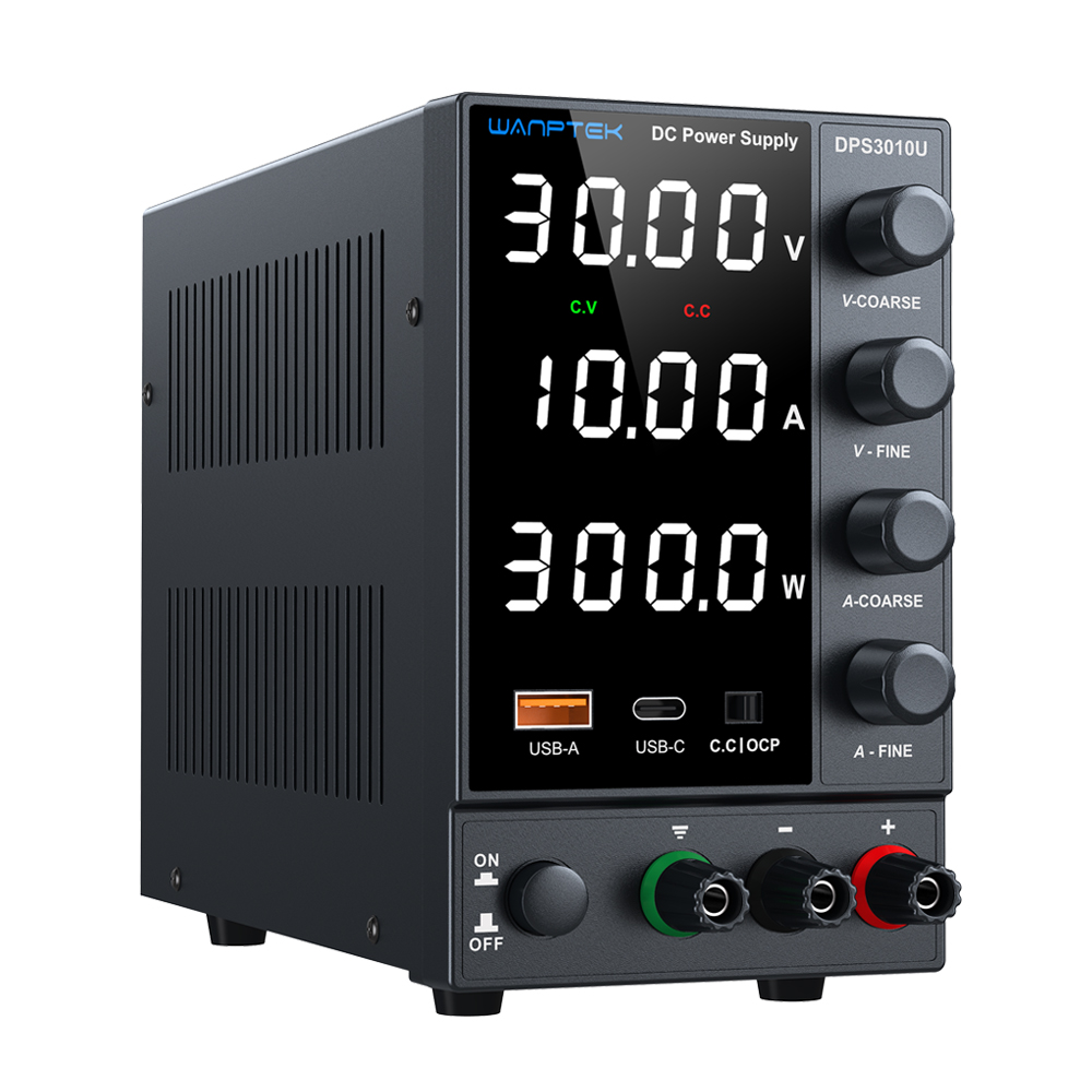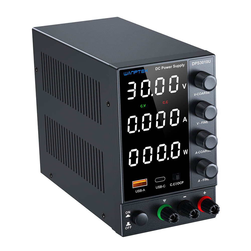 DPS系列产品是一款三窗口四位数显开关直流稳压电源,可同时显示电压、电流、功率。产品广泛用于手机维修、电脑维修、学校教学和生产线使用,使用编码电位器可以在0和标称值之间连续调节输出电压和输出电流,并且可以预先显示设定值,方便使用和调节。电源的稳定度和纹波系数都非常好,机器具有完美的OCP短路保护电路。辅助功能有USB-A/Type-C快速充电功能。其体积小、重量轻,设计美观、操作便捷、可以满负荷长时间工作,深受广大用户喜爱。